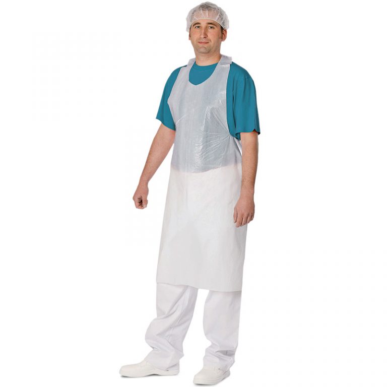 Radna kecelja za jednokratnu upotrebu od 100% polietilena, dimenzija 71 x 136 cm, debljine 0,025 mm, dostupna u dve boje. KAT I