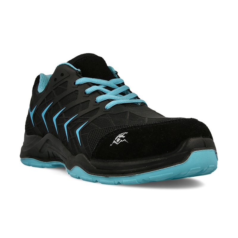 Plitke zaštitne cipele crne boje sa plavim detaljima, atraktivnog sportskog dizajna. Gornjište je proizvedeno od kombinacije specijalnog KPU materijala i nubok kože, koja garantuje otpornost na habanje, udobnost i paropropusnost. Tekstilna mrežasta postava je otporna na abraziju, omogućava koži stopala da diše i održava je suvom bez neprijatnih mirisa. Zaštitna kapa je od kompozitnog materijala. Dvoslojni antisatik PU/PU đon je otporan na abraziju, protivklizni, sa apsorberom energije u oblasti pete. Imaju ispunjen jezik i deo oko članaka za veću udobnost.